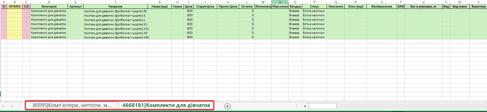 Автоматично буде вивантажено порожня таблиця із закріпленою структурою вгорі файлу. У таблиці показується основна інформація і параметри товару, в нижній частині шаблону категорії, які додані в кабінеті, кожна категорія розміщується на окремій сторінці. ID — призначаються автоматично системою, повинен бути пустим, OFFER ID — заповнюється за потребою, якщо необхідно вказати конкретний id, CID — категорія id, заповнювати непотрібно. Посилання на зображення додаються підряд через кому с крапкою ";".
