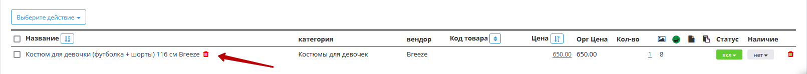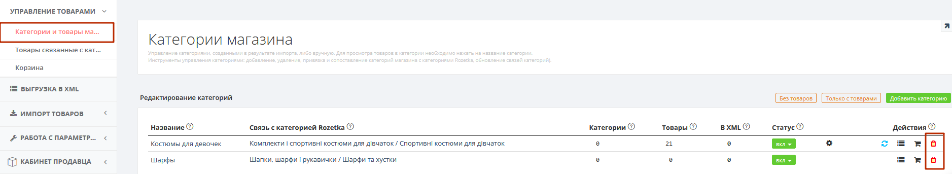Щоб видалити категорію з товарами, перейдіть на сторінку "Категорії та товари магазину", в кінці рядка натисніть на значок видалення та підтвердіть дії.