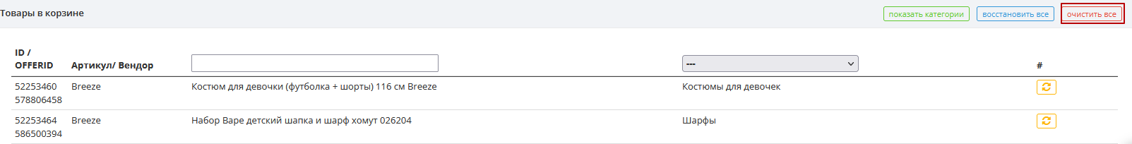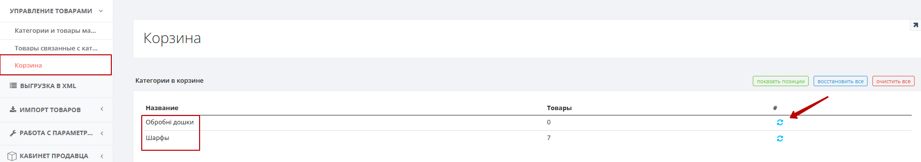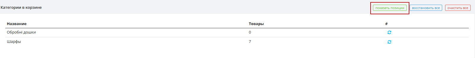 Перейдіть до розділу "Керування товарами" → "Кошик". На сторінці відображаються видалені категорії. Щоб відновити категорію з товарами, натисніть на позначку в кінці рядка.