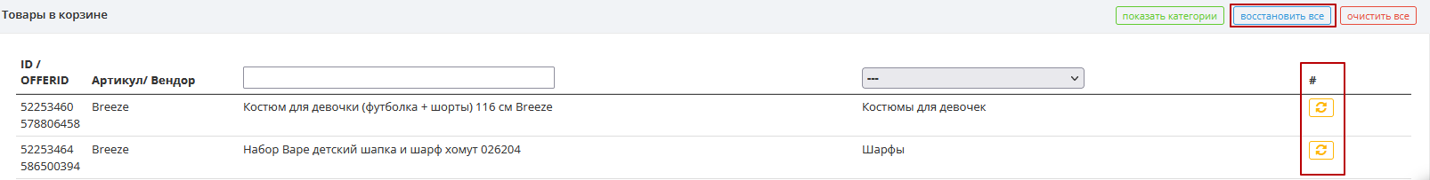 Для відновлення товару натисніть "Відновити позицію" в кінці рядка або на "Відновити все", якщо необхідно відновити всі товари в кошику