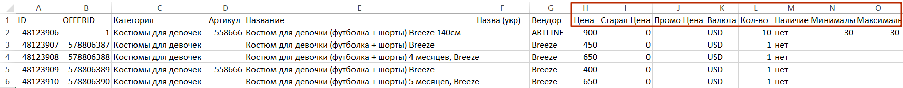 - значення стовпців "ID" "OFFERID" "CID" "Категорія" "Назва" — не видозмінювати;