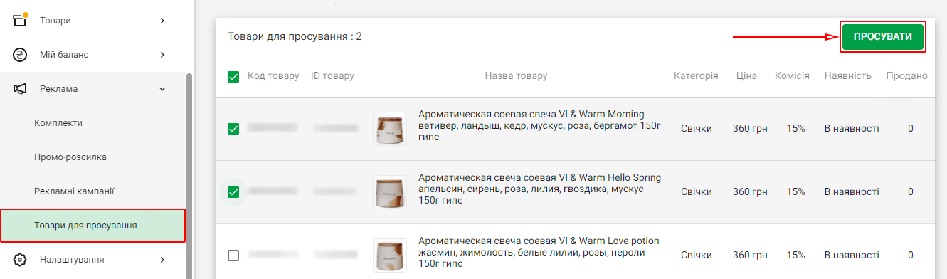 Щоб створити заявку для масового просування товарів, виберіть товари, натисніть "Просувати", вкажіть необхідні параметри для створення рекламних оголошень і натисніть "Готово". Для товарів з різних категорій відображається загальна максимальна/мінімальна ставка.
